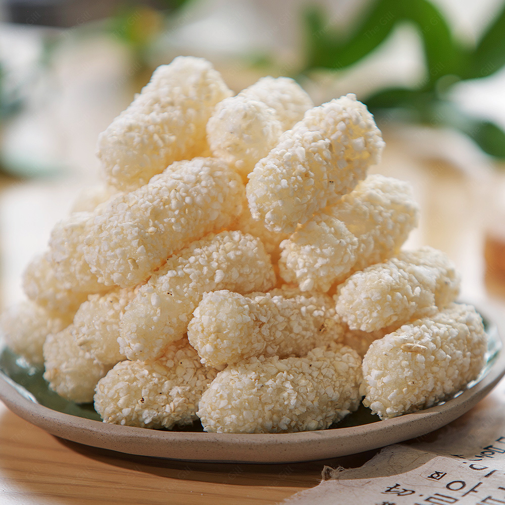 조청에 버무린 유과를 쌀 튀밥에 묻혀 식힌 후, 보관하거나 바로 즐길 수 있습니다.